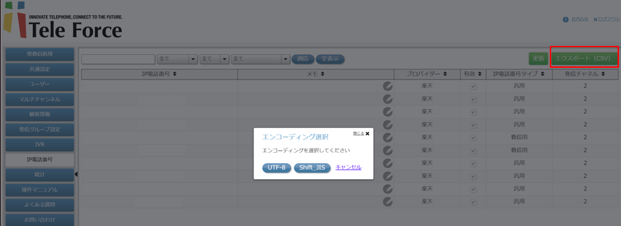 IP電話番号データは画面右上の[エクスポート]ボタンから情報出力可能です。